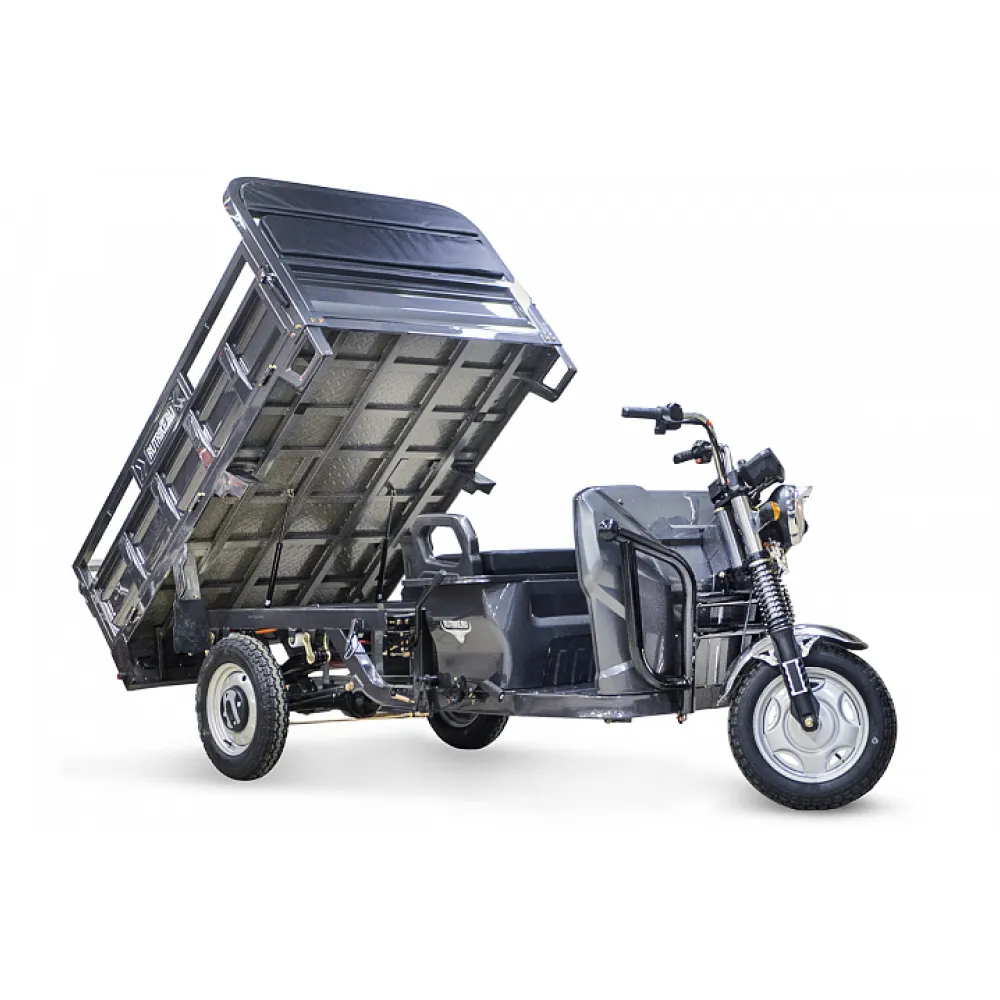 Грузовой электротрицикл Rutrike D4 NEXT II 60V1500W синий – мощная техника в презентабельном дизайне моментально привлекает внимание представителей бизнеса и фермеров. Объемный багажник, вместительное виденье, лучшие параметры удобства и комфорта заставляют внимательнее присмотреться к техническим характеристикам. Наш интернет-магазин предлагает купить электротрицикл по разумной стоимости. Каждому покупателю гарантирована бесплатная консультация, помощь в оформлении заказа. Модель оснащена мощным движком на 1500 Вт, который в сочетании с емкой батареей (от 55А*ч) обещает максимальный разгон до 25 км/час, которого хватает на преодоление дистанции до 80 км. Производитель обращает внимание, батарея не входит в комплектацию. Купить АКБ, подобрать максимально совместимую можно благодаря нашему интернет-магазину. Из других преимуществ производитель выделяет максимальную оснащенность функционалом. Техника оборудована зеркалами заднего вида, гидравлической амортизационной подвеской, информационным дисплеем. Имеется дополнительное место для пассажира. Широкая платформа для ног в сочетании с сиденьем исключает дискомфорт и проблемы с позвоночником. Широкие колеса (переднее х заднее - 3,50-R12 х 4,00-R12) отлично сцепляются с грунтом. Вместительный кузов размерами 3270 x 1200 x 1450 ДхШхВ – настоящая находка для предприимчивых личностей