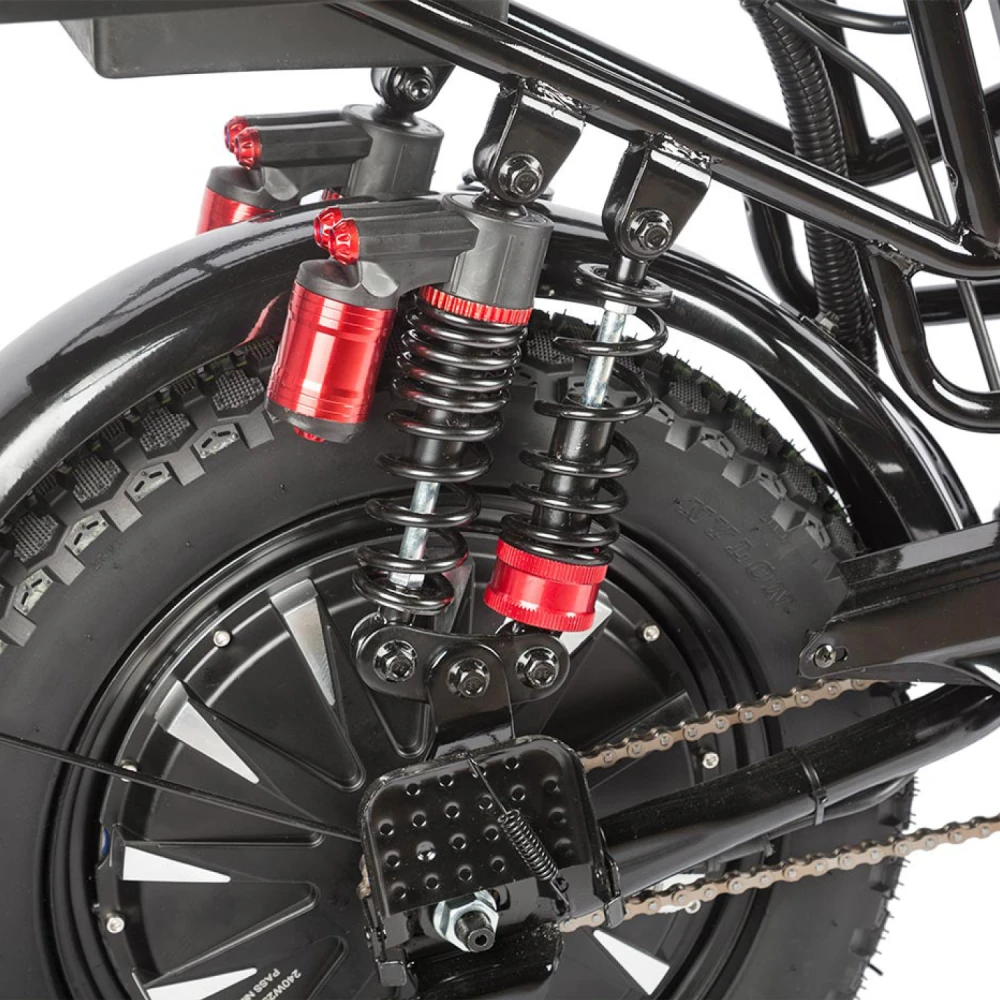 Электровелосипед Eltreco Gelbert Khan Monster 1 – это современное средство передвижения, сочетающее в себе продуманную конструкцию, передовые технологии и стильный дизайн для уверенных городских и пригородных поездок.Модель оснащена передним и задним амортизаторами, которые эффективно смягчают неровности дороги, обеспечивая плавность хода и комфорт даже на пересеченной местности. При заявленном максимальном пробеге до 100 км на одном заряде этот велосипед подходит для длительных поездок – конечно, реальные показатели зависят от веса райдера, рельефа местности, погодных условий и температуры окружающей среды.Безопасность обеспечивается за счет дисковых гидравлических тормозов, которые гарантируют надежное и своевременное торможение в любых ситуациях. Легкий вес в 57 кг позволяет легко маневрировать, а максимальная нагрузка до 150 кг делает модель универсальной для разных категорий пользователей.Двигатель мощностью 240 W, размещенный в задней части, обеспечивает эффективное ускорение и оптимальное распределение энергии, что способствует стабильной работе в условиях городской среды. Электровелосипед оборудован аккумулятором с емкостью 21 Ah и рабочим напряжением 60 V, что гарантирует долгий срок службы батареи и надежную работу даже на длинных маршрутах.Габариты в собранном состоянии – 1700×1150×800 мм – обеспечивают удобное расположение для водителя, а использование качественной стали в конструкции гарантирует долговечность и надежность всей системы. Дополнительное оснащение включает зеркала заднего вида, которые повышают безопасность, а встроенные передние и задние габаритные фары обеспечивают отличную видимость в условиях недостаточной освещенности.Стоит отметить, что данная модель не является складной, что подчеркивает ее прочную и стабильную конструкцию, рассчитанную на долгосрочную эксплуатацию. Электровелосипед Eltreco Gelbert Khan Monster 1 – это оптимальное решение для тех, кто ищет сочетание высоких технологий, надежности и комфорта в одном устройстве.