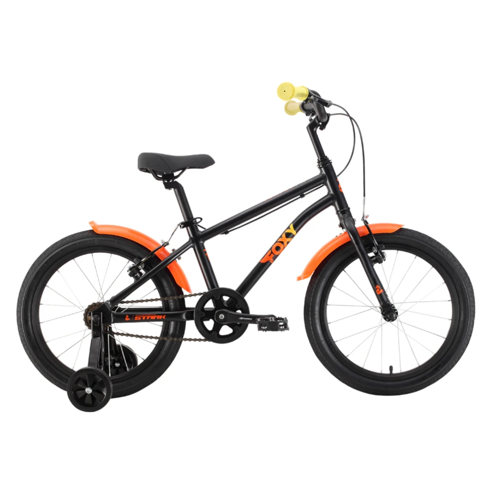 Дополнительно, велосипед Stark'22 Foxy Boy 18 черный/оранжевый/желтый имеет два детских колесика, которые обеспечивают стабильность и помогают начинающим велосипедистам освоить навыки езды.